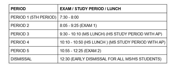 All Wynford Middle/High School (Grades 6-12) students will be on an exam schedule on Tuesday, December 19, 2023, and Wednesday, December 20, 2023 On both days, all middle school and high school students will have a 2-hour early release and will be dismissed from school at 12:30 p.m.